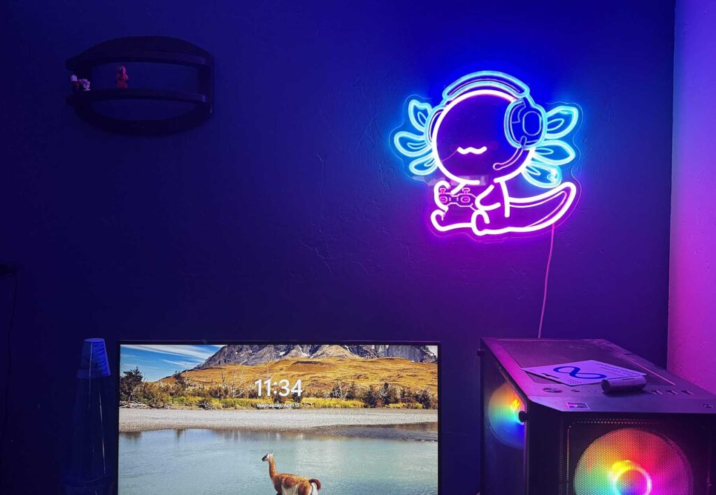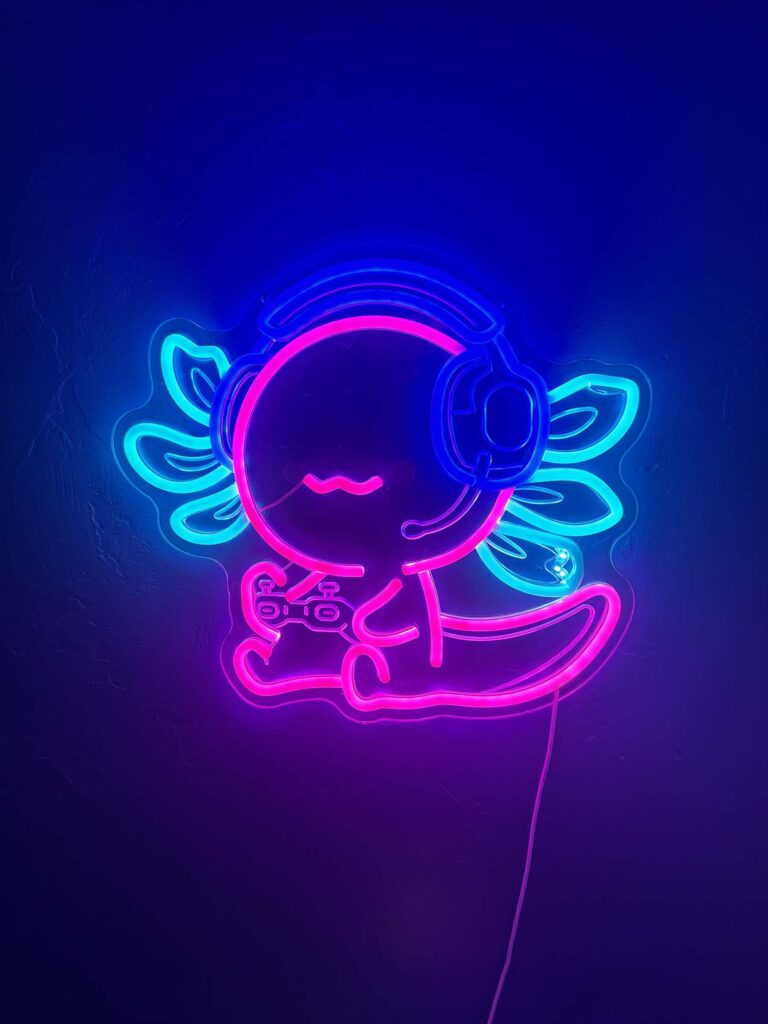 Not only had he requested axolotl stuff, but he also wanted a neon sign. I thought to myself, “How cute would a neon axolotl sign be!” I was scrolling through the limited options for an Axolotl neon sign when I came across the perfect one! It was the trifecta: a neon sign that was not only an axolotl, but a gaming axolotl. My son is also a huge gamer so it couldn’t have been better. I was hesitant because it didn’t have many reviews at the time, but I took the chance and ordered it.