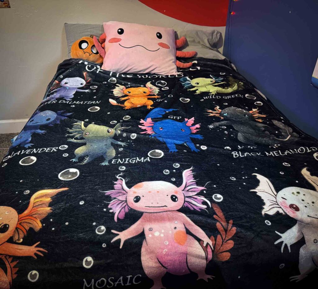 Why we loved this one. It was much bigger, I did make sure to select the 60×80 size. It’s also thick and super cozy soft. Besides the comfort, it shows different axolotls and is a really cute print. Although some of the reviews say it is thin, I would have to disagree. I think it’s a perfect blanket to cuddle up with on a family movie night.